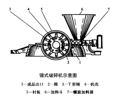 錘式破碎機屬于一種微型破碎設(shè)備,其結(jié)構(gòu)如上圖所示,主要由安裝在高速旋轉(zhuǎn)主軸上的T形錘、帶有襯板的機殼、篩、加料斗和螺旋加料器等組成,具有結(jié)構(gòu)簡單、操作方便、維修容易的特點。