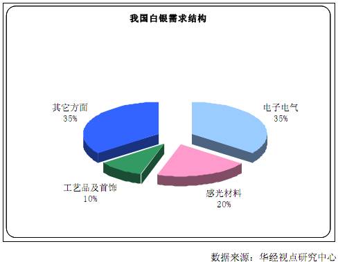 我國(guó)國(guó)內(nèi)白銀的主要消費(fèi)領(lǐng)域及消費(fèi)結(jié)構(gòu)大致為:電子電氣35%、感光材料20%、工藝品及首飾10%、其它方面15%。